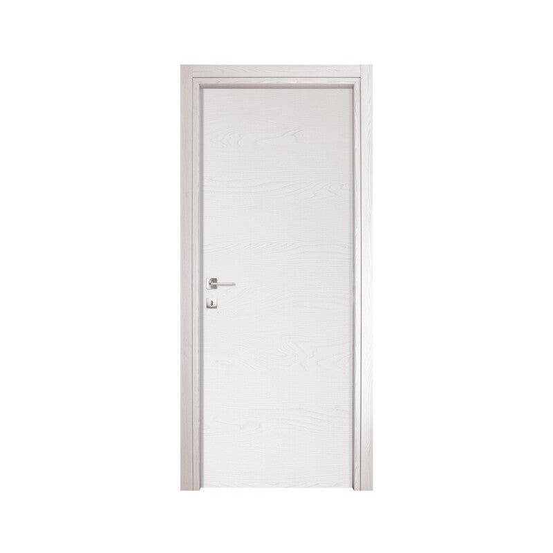 Anta tamburata di spessore nominale 44 mm, riempimento in cartoncino trattato, placcato con pannelli in MDF spessore 3/4 mm nobilitato con carta finish. Telaio piatto in MDF di spessore 40 mm con guarnizione di battuta di gomma. Coprifilo telescopici esterno ed interno in Mdf da 60 mm con aletta utile da 8 mm. Ferramenta serratura mediana. Anuba reversibili. Dimensioni 210x60 cm. Colore bianco frassino