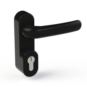 con cilindro. Comando esterno meccanico compatibile con tutti i dispositivi Antipanic. In lega pressofusa verniciata. Perno di fissaggio stabilizzante. Finitura nero RAL 9500.