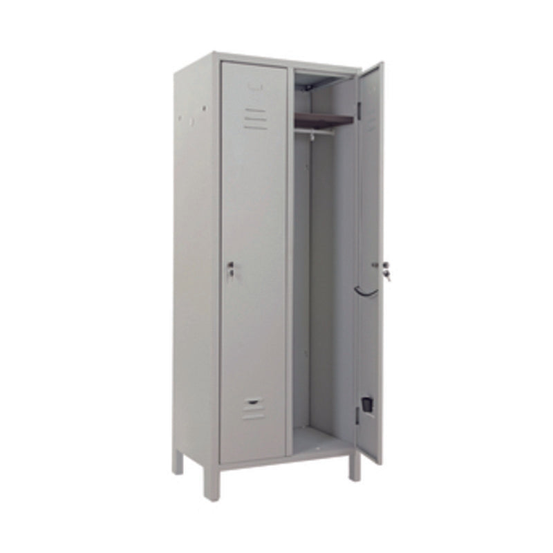 struttura in lamiera in acciaio pressopiegata verniciata con feritoie di aerazione e portacartellino. Ripiano in plastica antitaglio. Cerniere interne antiscasso. Chiusura con serratura. A 2 posti. Corredato di serie da portaombrelli, portasciugamani, appendiabiti. Dimensioni cm 68x35xh 179,5 cm. Colore grigio. Da assemblare.