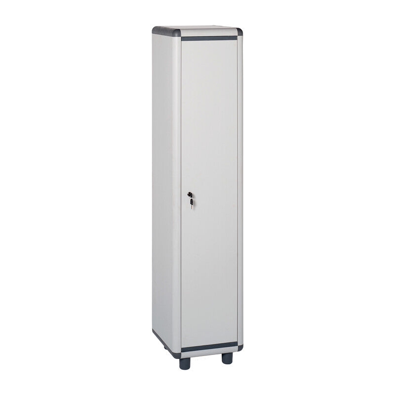 Mod. 1 Posto in resina adatto per esterno ed interno. Anta singola con serratura a chiave. Scomparto interno con appendiabiti. Pannelli estrusi di PVC da 40 mm autoestinguenti. Facile da assemblare. Dimensioni 39 x 39 x h 175 cm. Colore grigio. Peso 11,3 kg.