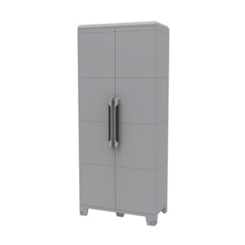 multifunzione Art. MODULAR 4 in resina antiurto. Anti UV. Cerniere antivento in metallo. Fondo rinforzato con 6 piedi di cui 2 frontali regolabili in altezza. Moduli interconnessi e sovrapposti. Ideali per esterni IP43. Resistente alle temperature -5/+40C. Doppia anta a battente con tre ripiani interni modulari. Maniglia in materiale bicomponenete. Portata piano base max 80 kg, ripiano max 40 kg (uniformemente distribuiti). Dimensioni 78x43,6xh184,4 cm. Dimensioni imballo 88x45xh52 cm.