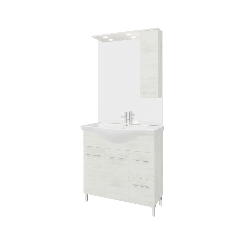 Base due ante, due cassetti con lavabo consolle cm. 86 e specchiera con pensile ed ill. LED rovere bianco FSC MIX