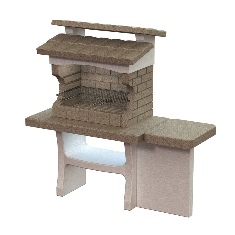 Mod. LUXOR Barbecue in pietra ricostruita con tavolo laterale per ampia superficie di lavoro. Focolare e tetto in stile briquette con griglia di cottura cromata 67x40 cm regolabile in 4 altezze. Base con pratico ripiano. Tinto nellimpasto. Montaggio facile. Dimensioni 159x72xh162 cm