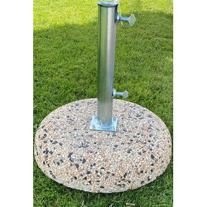 In ghiaino fantasy, composizione cemento sabbia e ghiaia, completo di tubo in ferro con trattamento zincatura a freddo, diametro esterno mm 55 diametro interno mm 52, altezza tubo cm 30, per palo da 42 a 50mm, sistema fissaggio tubo con 4 viti e chiavetta per serraggio viti in dotazione, diametro base cm 44, altezza base cm 8