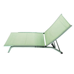 struttura con schienale reclinabile in acciaio verniciato verde. Tessuto in textilene verde salvia. Dimensioni 195x63xh34 cm.
