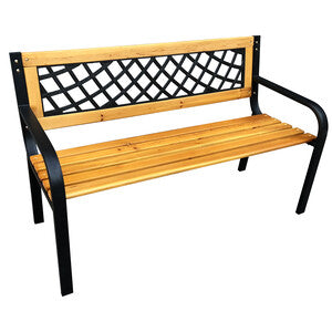 panchina in acciaio con seduta e schienale in legno. Decoro schienale in plastica. Doga in legno dimensioni 118x1,7x5,4 cm. Portata max 220 kg.