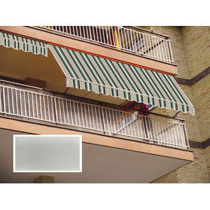 per balcone, porticato o terrazzo, a caduta libera con struttura in alluminio verniciato bianco. Cilindro in alluminio d 60 mm. Tessuto in poliestere 280 g/m2, spalmato in PU. Barra anteriore in alluminio 45x25 mm. Barra di supporto in alluminio 44x25 mm. Avvolgibile. Provvista di manovella.