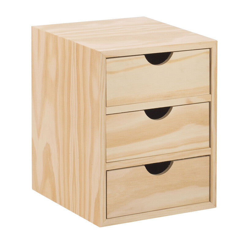 Contenitore multiuso a tre cassetti in legno impiallacciato pino massiccio grezzo, PEFC spessore 11 mm. Prodotto gi montato. Dimensioni 210 x 200 x h 280 mm.