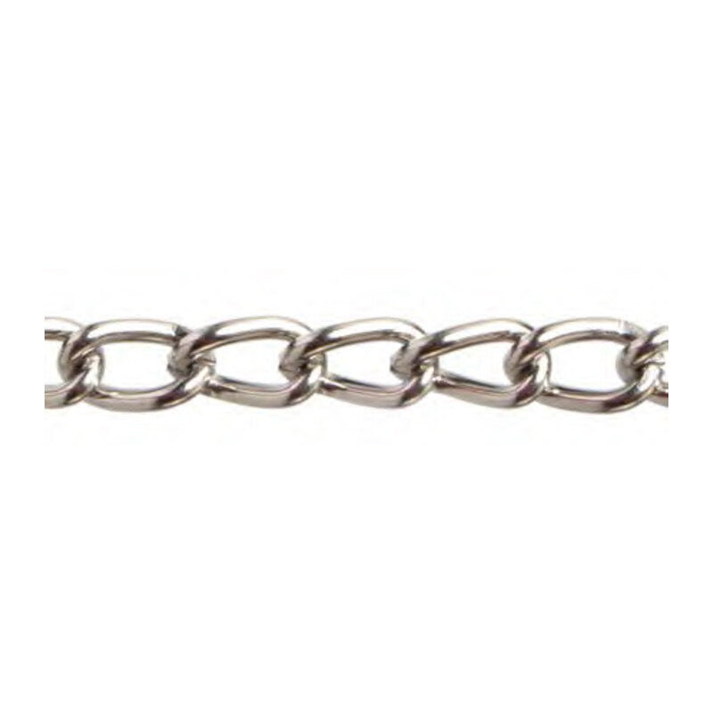 catena decorativa a filo ritorto, pretagliata. Spessore 3 mm. Dimensioni maglia 18 x 11 mm. Lunghezza catena 2,5 m. Finitura nichelata
