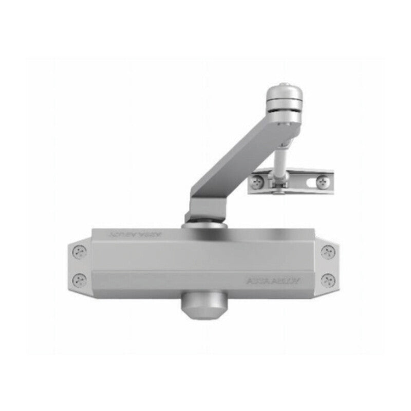 Serie DC 110- EV1 corpo in lega di alluminio con braccio a compasso. Per porte ad azione singola larghe fino a 1100 mm con apeertura a destra e sinistra. Senza arresto. Adatto a porte tagliafuoco e tagliafumo. Certificazione in conformit EN 1154. Colore argento