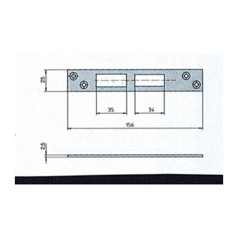 Art. 06232.01 contropiastra in acciaio zincato. Per serrature Art. 57313-57318-57353-57358. Dimensioni 25,5 x 2,5 x h 156 mm. Peso 0,056 kg.