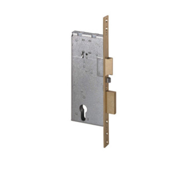 Art. 12011.60 Scatola in acciaio con rivestimento in zinco. Frontale e contropiastra in ottone satinato. Scrocco reversibile elettrificato. Tensione 12 V ca CE. Corrente assorbita 2,8A. Catenaccio 2 mandate. Scrocco e catenaccio con ritorno automatico. Entrata 60 mm. Scatola 98x183 mm. Dotazione Contatti elettrici. Viti fissaggio serratura e cilindro. Foglio istruzioni. Cilindro da ordinare a parte. Peso 1,144 kg.