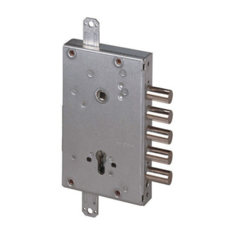 Art. 56505.48 applicazione planare. Dispositivo di azionamento tramite sistema ad ingranaggi che riduce lo sforzo sulla chiave. Scatola in acciaio con rivestimento in zinco. Scrocco reversibile e catenacci in acciaio zincato alta resistenza. Chiusura triplice e 5 catenacci. A 2 mandate. Scatola 125x203 mm. Interasse 85 mm. Entrata 64 mm. Ambidestro. Peso 2,235 kg.
