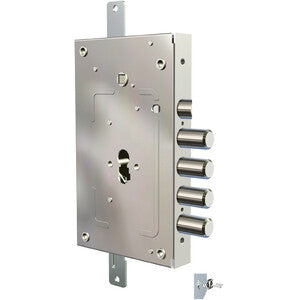 Art. 2655/28 PE applicazione planare. Chiusura triplice con scrocco reversibile e 4 catenacci. Scatola mm 142x227