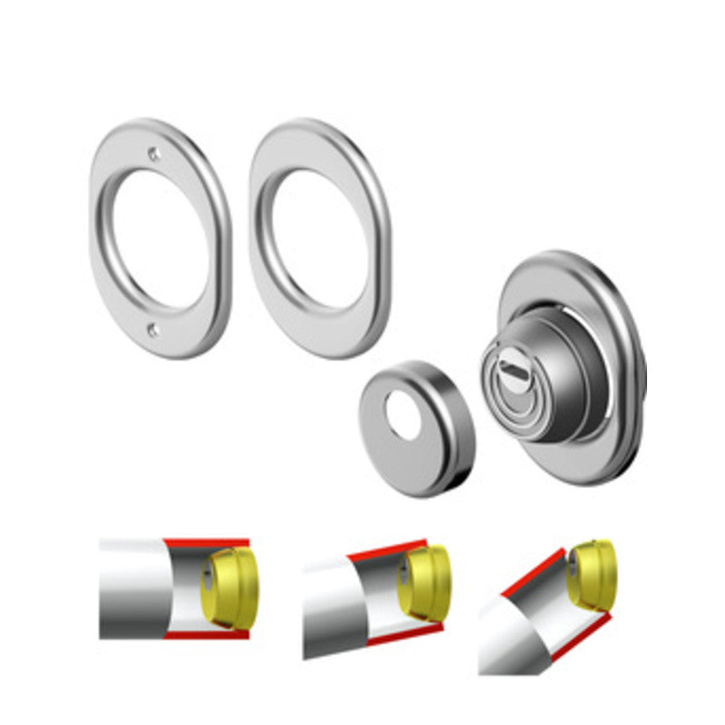 Mod. SFERIK BDS 68 corpo in acciaio temperato e copertura in ottone. Interasse fori fissaggio 31 mm. Con mostrina. Per serrature ATRA. Finitura cromo satinato