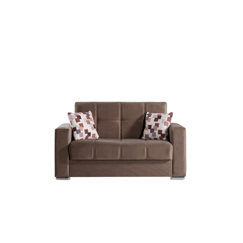 Divano 2 posti cm 158x85x92 con braccioli, 2 cuscini, con cassettone porta oggetti, imbottitura a molle e storage in MDF retro finito. Colore cappuccino.