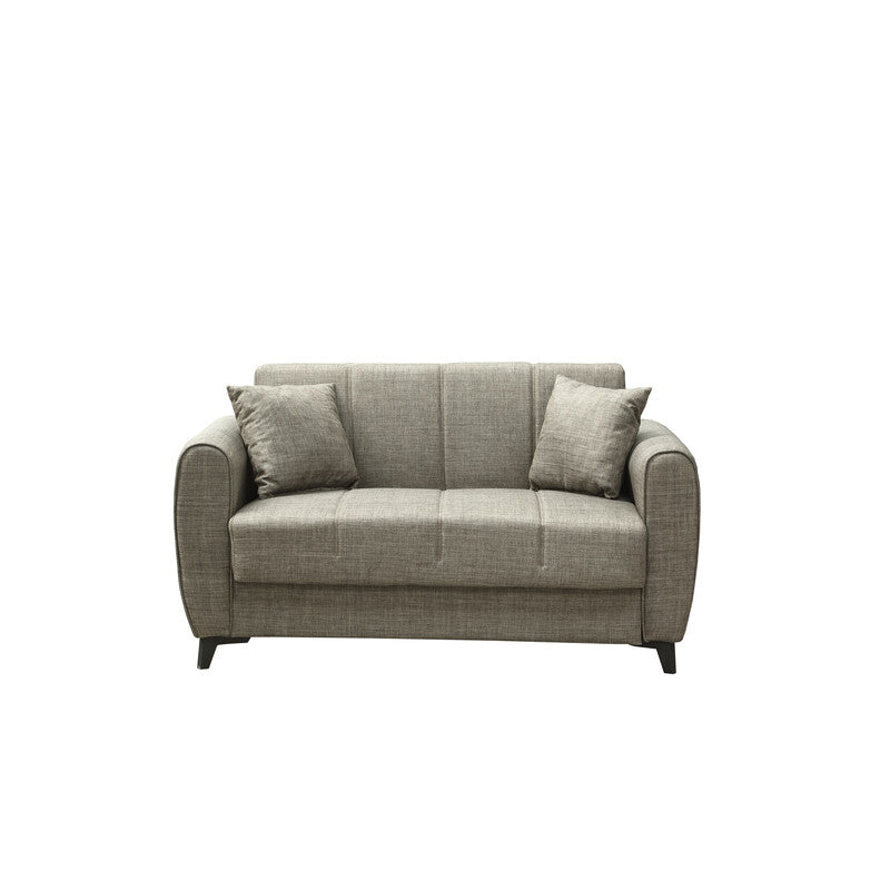 divano 2 posti funzione clic clac Delhi, seduta con molle bonnel, tessuto colore mina 07 tortora, piedi in plastica neri dimensioni divano cm 149x78x78
