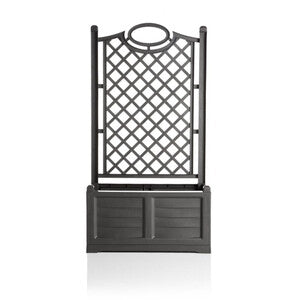Fioriera con spalliera posizionabile in due soluzioni, centrata rispetto la base oppure nella consueta posizione a schienale, resistente e facile da montare, finitura superficiale in rilievo crea un effetto legno molto realistico, resistente agli sbalzi di temperatura e ai raggi solari, dimensioni l80x42,5xh150 cm. Capacit 120 lt.