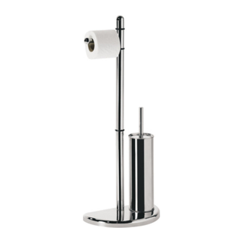 In metallo con portascopino e portarotolo a base semicircolare, ideale per piccoli spazi. Colore cromo. Dimensioni 29,6 x 18 x h 75 cm. Art. HI32