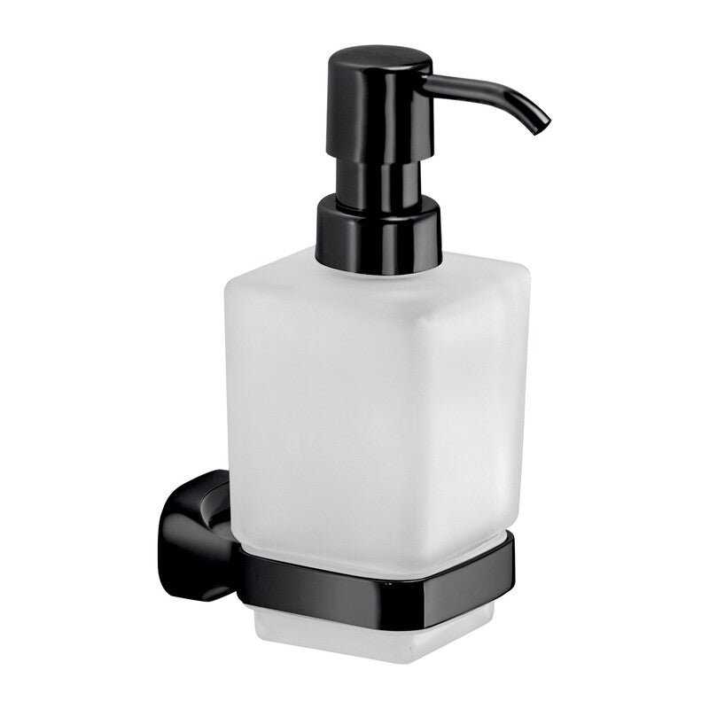 Dosatore porta sapone liquido realizzato in acciaio inox e Cromall con erogatore a pompa in plastica e contenitore da muro in vetro satinato. La serie pu essere incollata alle piastrelle, oppure fissata nel modo tradizionale con viti e tasselli (non compresi). Portata max 7 Kg. Colore nero matto. Dimensioni 6,4 x 10,6 x h 15,8 cm. Art. ST80