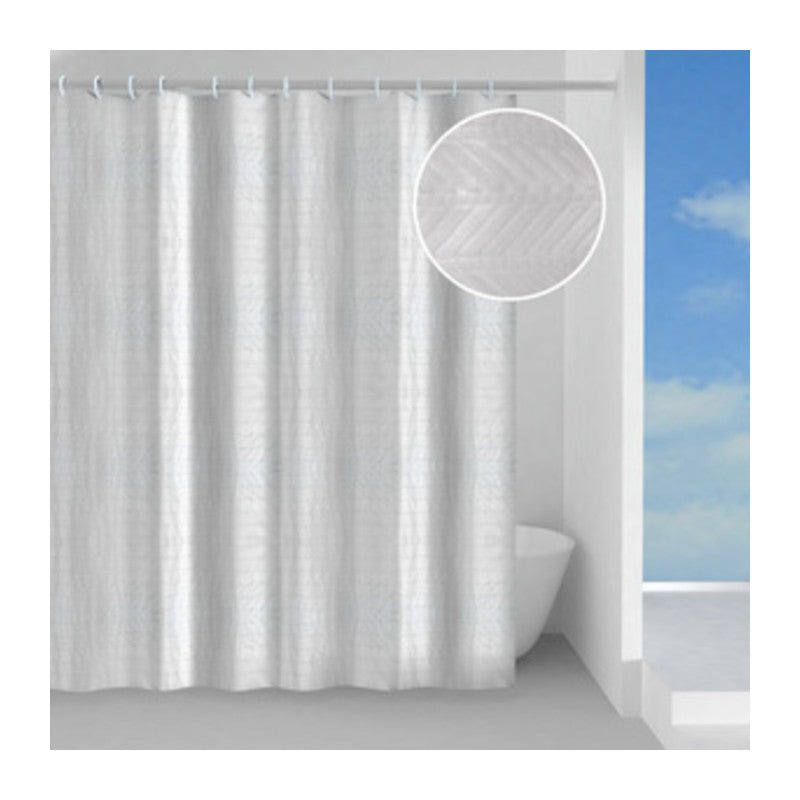 realizzata in poliestere. Completa di anelli. Lorlo inferiore contiene un filo di polipropilene per mantenere la tenda sempre tesa. Dimensioni 240 x 200 cm. Colore bianco. Disegno neve.