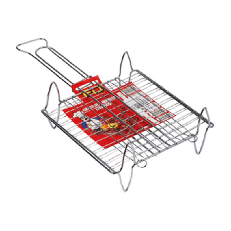 a forma quadrata, realizzata in acciaio cromato con piedini rialzati su ambo i lati. Griglia doppia incrociata e manici con chiusura di sicurezza che facilita limpugnatura e la rotazione della graticola. Dimensioni 27 x 27 cm.