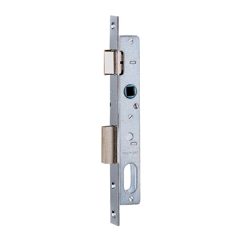 Art. 750.15.2  catenaccio prolungato. Scrocco separato con richiamo quadro maniglia. 1 mandata. Cilindro ovale. Quadro maniglia 8 mm. Entrata 15 mm. Frontale un acciaio cromato 20 mm