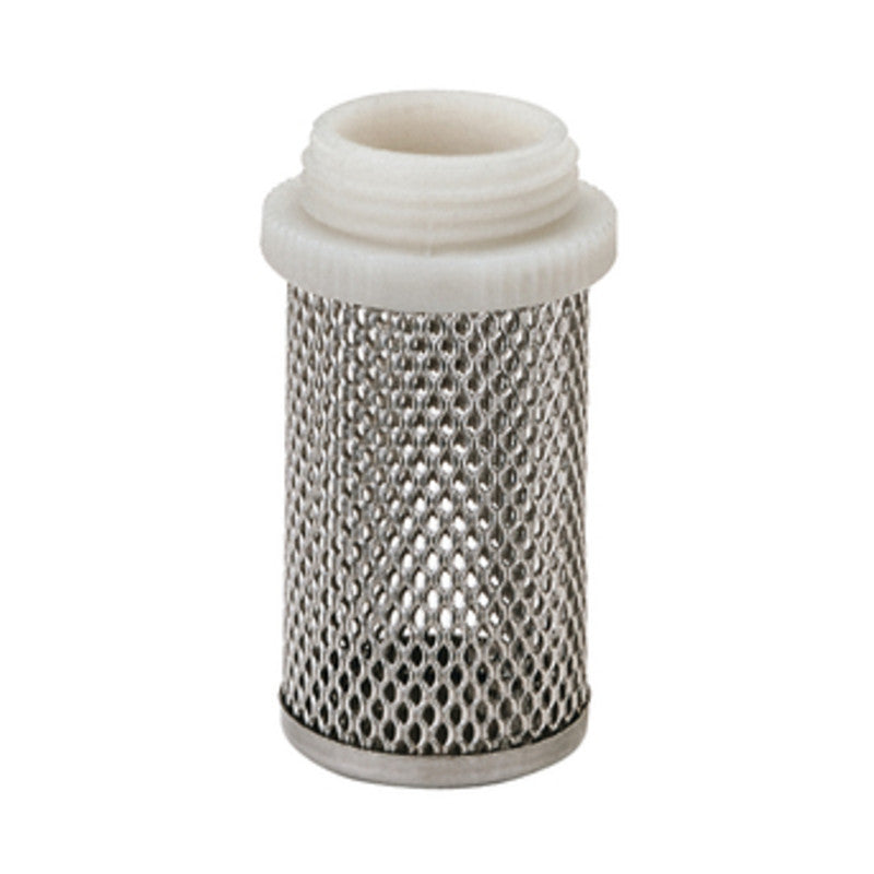 Art. 102 rete in acciaio inox Aisi 304. Grado di filtrazione 1200 m. Parte filettata in polimero. Dimensioni 36x57,5 mm. Diametro