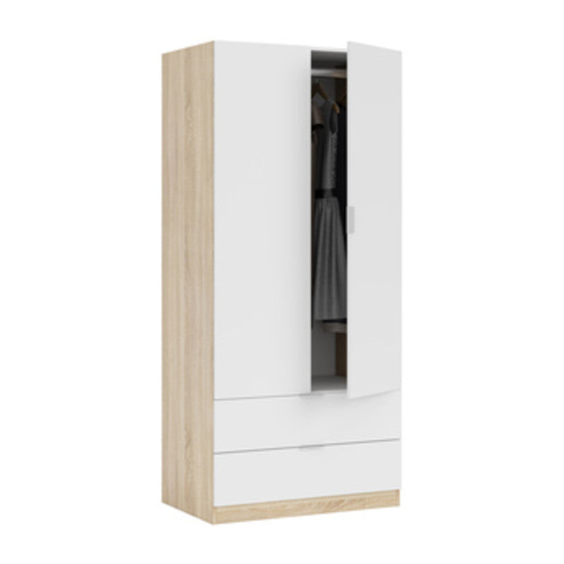 armadio salvaspazio a 2 ante e 2 cassetti nella parte inferiore, in truciolare con rivestimento in melaminico. Cassetti con guide metalliche. Bastone appendiabiti in metallo. Maniglie metalliche. Caratterizzato dallabbinamento di due sobrie finiture, come il rovere Canadian e il bianco Artik. Facile da montare e da pulire. Dimensioni 80 x 52 x h 180 cm. Interno di colore bianco. Istruzioni montaggio allinterno.