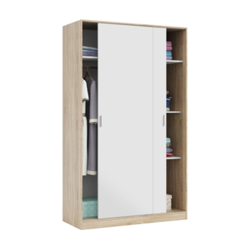 armadio salvaspazio a 2 ante scorrevoli in truciolare spessore 18 mm con rivestimento in melaminico. Maniglie in colore metallico. Da un lato barra portaabiti in metallo, dallaltro 2 ripiani (3 scomparti) ripiano alto per tutta la larghezza dellarmadio. Caratterizzato dallabbinamento di due sobrie finiture, come il rovere e il bianco. Facile da montare e da pulire. Dimensioni 120 x 50 x h 200 cm. Istruzioni montaggio allinterno.