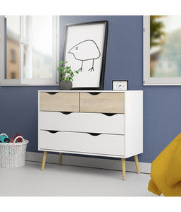 con finitura laccato bianco, dotata di 2 spaziosi cassetti + 2 cassetti finitura rovere naturale e gambe svasate in legno. Facile da montare e da pulire. Dimensioni 98,7 x 39,1 x h 81,7 cm