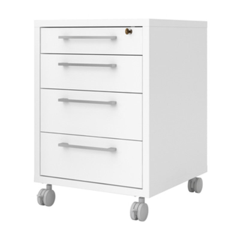 Art. 80419-49AK Cassettiera in kit linea Prima a quattro cassetti e 4 ruote con struttura in truciolare rivestito in melaminico. Il 1 cassetto e munito di serratura. Dimensioni 48 x 49 x h 68 cm. Colore bianco.