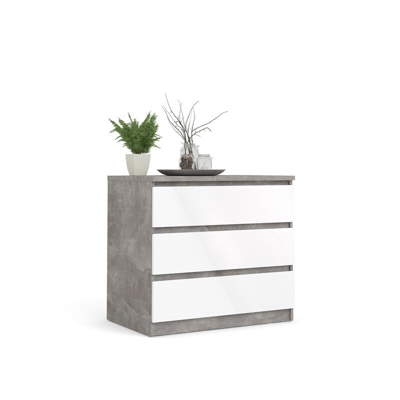 Caratterizzato dallabbinamento di due sobrie finiture, come il bianco e il cemento, cassettiera salvaspazio a 3 cassetti. Facile da montare e da pulire. Dimensioni 77 x 50 x h 70 cm.