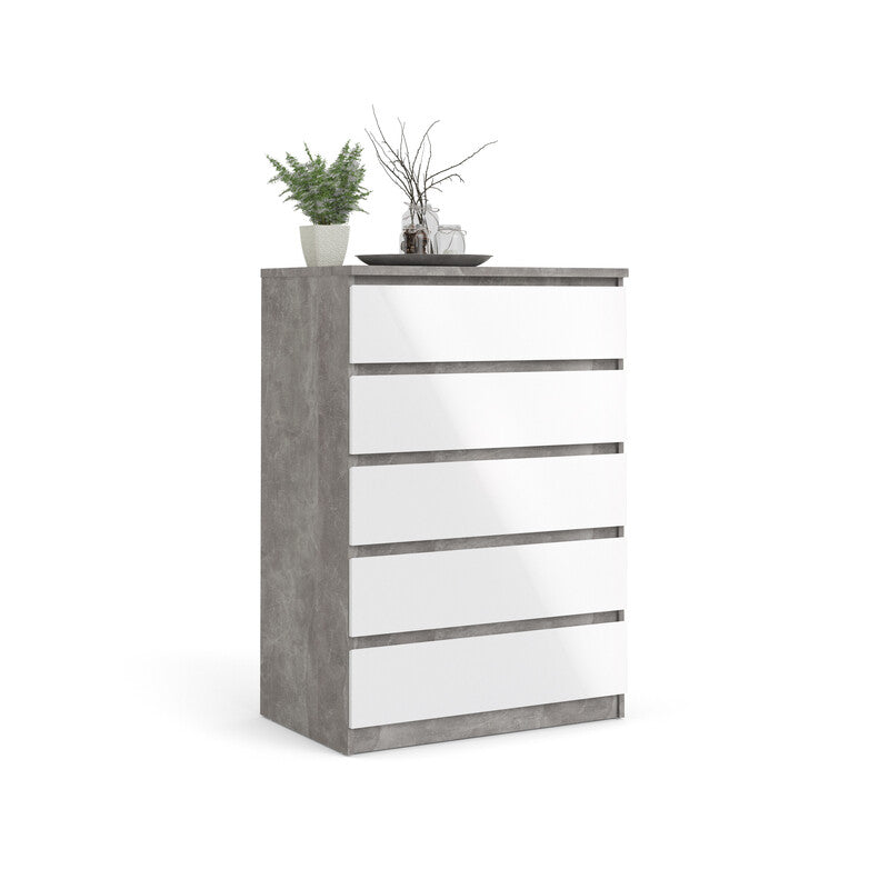 Caratterizzato dallabbinamento di due sobrie finiture, come il bianco e il cemento, cassettiera salvaspazio in truciolare a 5 cassetti. Facile da montare e da pulire. Dimensioni 77 x 50 x h 111 cm.