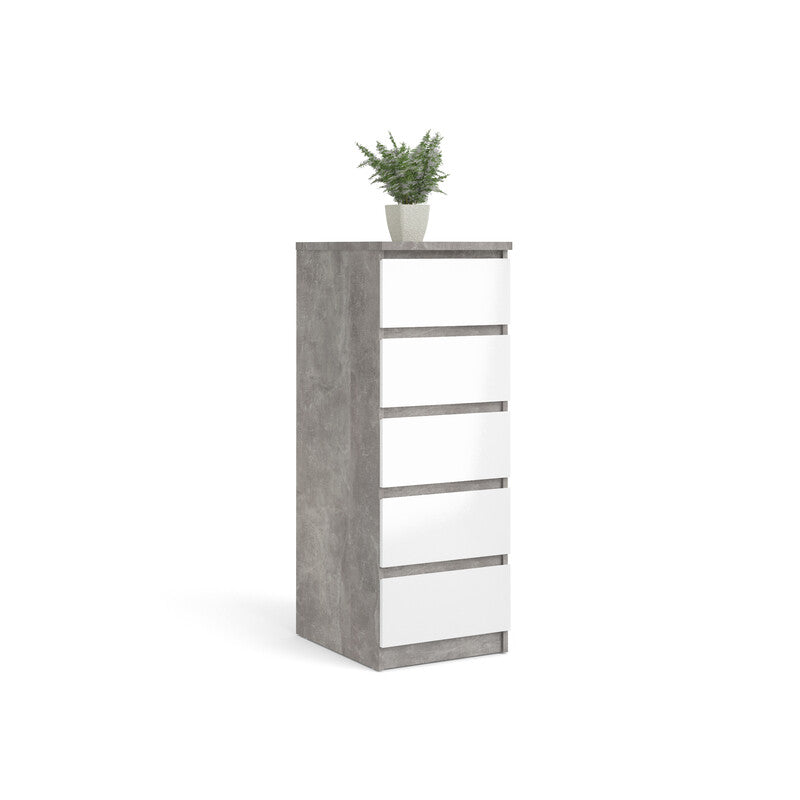Caratterizzato dallabbinamento di due sobrie finiture, come il bianco e il cemento, cassettiera slim salvaspazio in truciolare a 5 cassetti. Facile da montare e da pulire. Dimensioni 40 x 50 x h 111,3 cm.