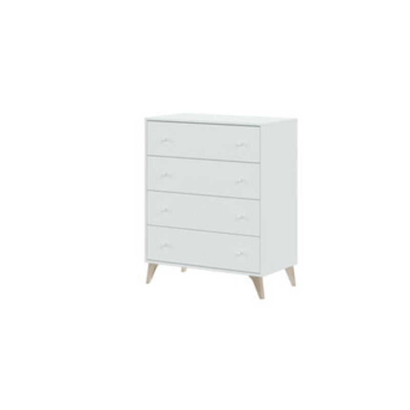 Mod. SWEET Questa cassettiera a 4 cassetti con capacita 71 x35 x h 10 cm, in truciolare da 15 mm con rivestimento in melaminico e gambe svasate in legno. Guide scorrevoli in metallo per i cassetti (non estraibili). Piedini ABS (termoplastica di alta resistenza) di colore marrone. Maniglie a sfera ABS di colore bianco. Facile da montare e da pulire. Dimensioni 77,5 x 40 x h 95 cm. Colore bianco