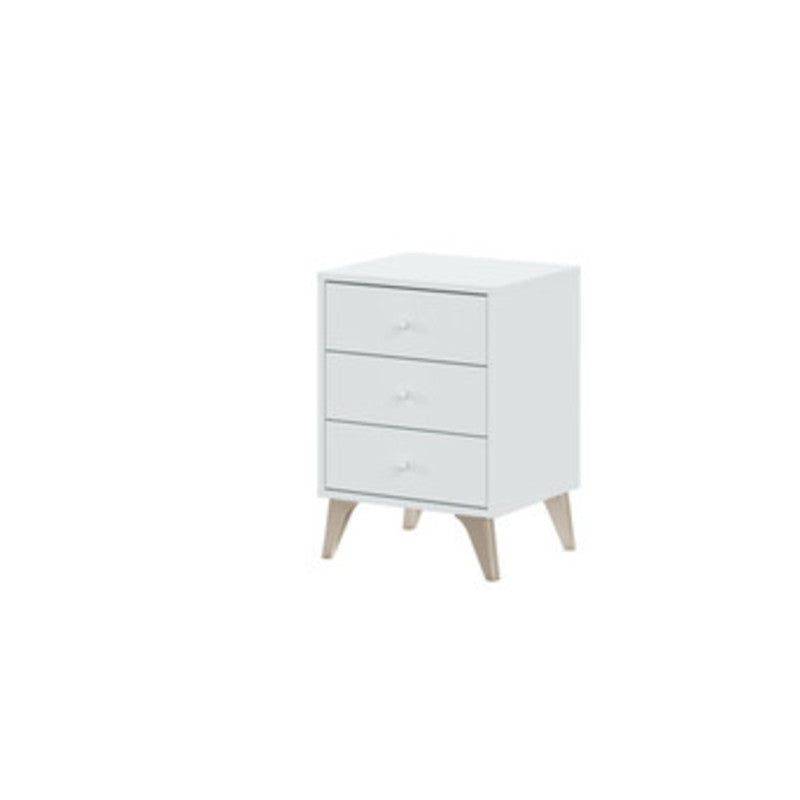 Mod. SWEET Questo comodino a 3 cassetti con capacita 34 x 25 x h 10 cm. Pannello in truciolare con rivestimento in melaminico spessore 15 mm, maniglie a sfera in ABS colore bianco e gambe svasate in legno. Bordi in PVC. Guide scorrevoli in metallo per i cassetti (non estraibili). Piedini ABS (termoplastica di alta resistenza) e di colore marrone. Facile da montare e da pulire. Dimensioni 40 x 33.5 x h 56 cm. Colore bianco.