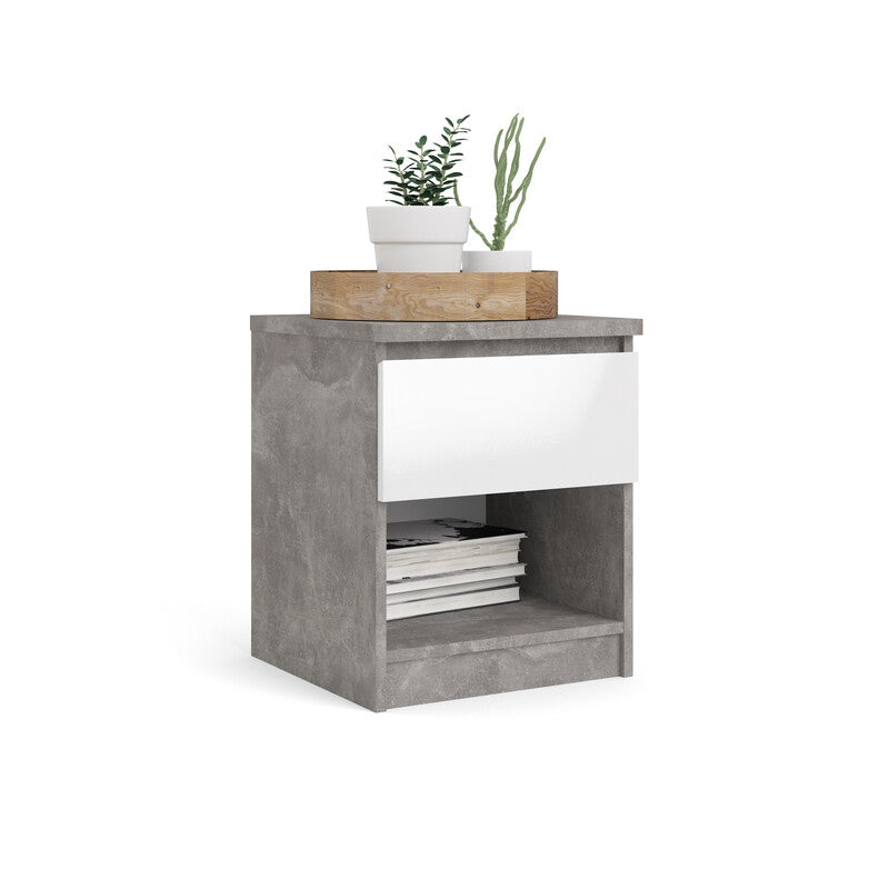 ha un cassetto e un piccolo vano contenitore nella parte inferiore, struttura in legno truciolare di colore cemento con cassetto di colore bianco. Facile da montare e da pulire. Dimensioni 40 x 50 x h 40 cm.