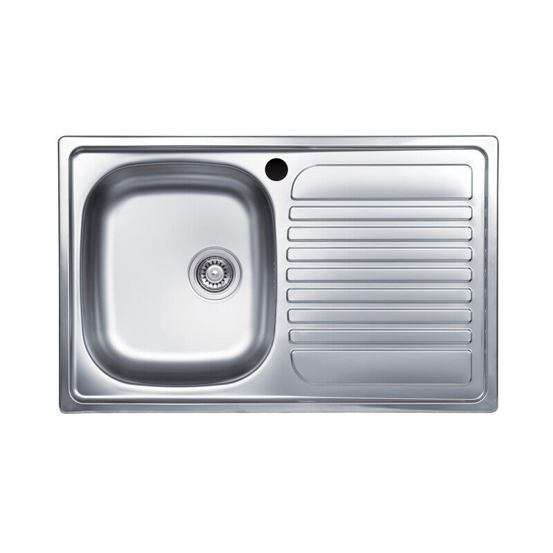 Lavello incasso monostampo con gocciolatoio a destra. Misure vasca 350 x 400 x 150 mm. Spessore 5 mm. Superficie satinata. Prodotto fornito semicartonato comprensivo di piletta 31/2. Dimensioni 790 x 500 mm.