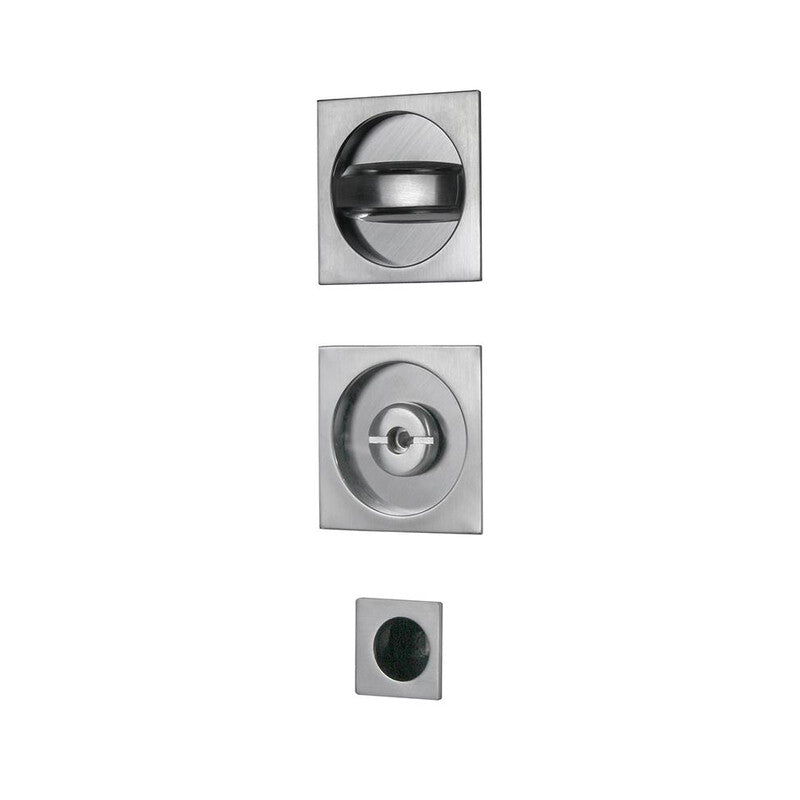 coppia maniglie bordo quadro 57X57 mm per porte scorrevoli. in zama. composto da - nicchia d48mm con nottolino- nicchia d48mm con vite di emergenza - nicchia di trascinamento d 25mmfinitura cromo satinato