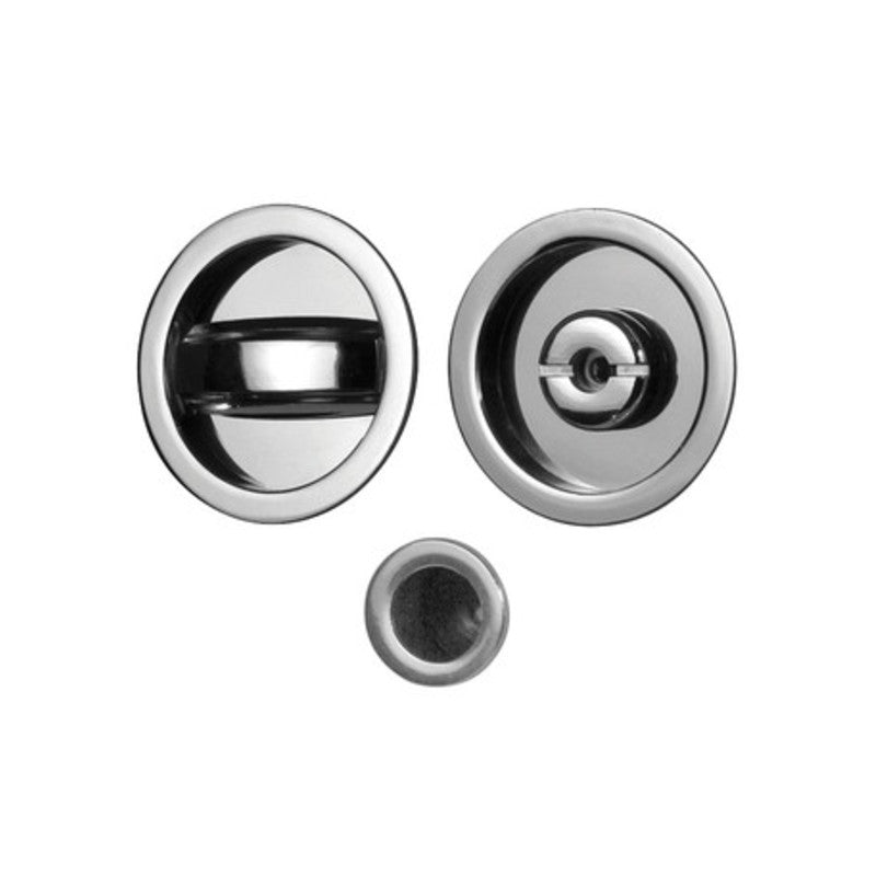COPPIA MANIGLIE BORDO TONDO X PORTE SCORREVOLI. IN ZAMA. COMPOSTO DA - NICCHIA D48MM CON NOTTOLINO- NICCHIA D48MM CON VITE DI EMERGENZA - NICCHIA DI TRASCINAMENTO D 25MMFINITURA CROMO SATINATO