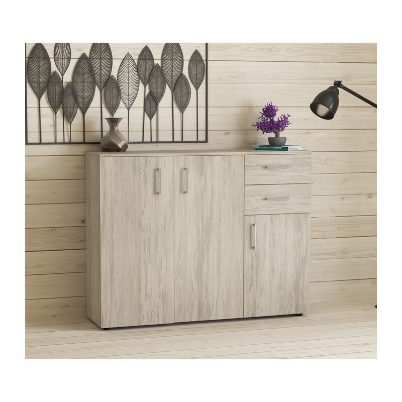 a 3 porte e 2 cassetti. Pannello truciolare melaminico spessore 15 mm. Facile da montare. Dimensioni 103 x 35 x h 92 cm. Colore bianco venato.