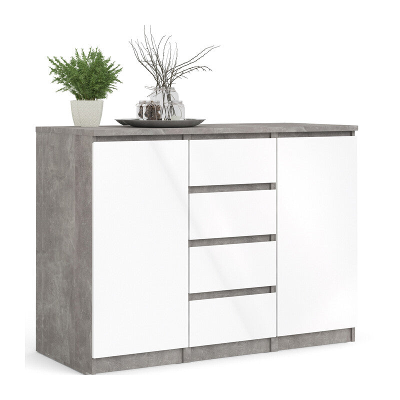 Il mobile si presenta in una sapiente combinazione di bianco per i frontali e sfumature di cemento per la struttura. Molto spazioso, munito di 4 cassetti, 2 ante e 2 ripiani interni. Facile da montare. Dimensioni 121 x 50 x h 90 cm.