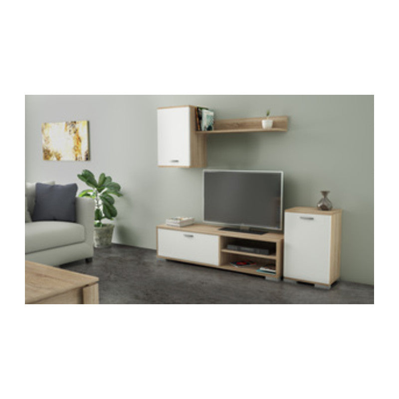 composta da 2 basi mobile porta TV 138 x 40 x h 30 cm, base 40 x 30 x h 55 cm, pensile 40 x 30 x h 55 cm e mensola 90 x 15 x h 20 cm.Colore bianco e rovere
