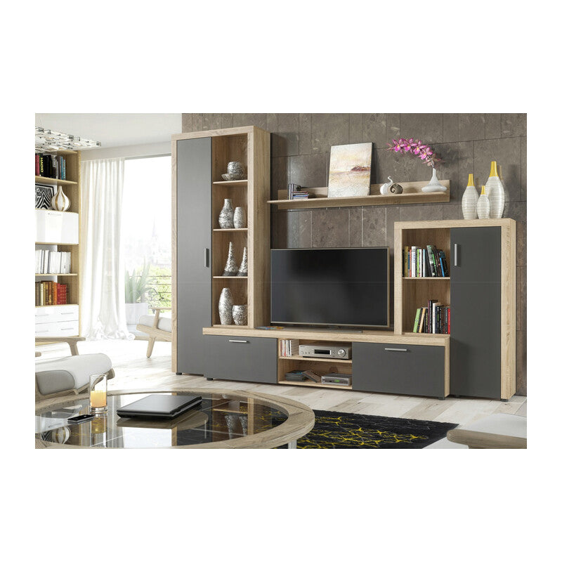 mobile da parete con mensolone, 8 vani, 4 ante e vano Tv da 120 cm. Pannello truciolare melaminico spessore 15 mm. Dimensioni 263 x 40 x h 200 cm. Colore naturale e antracite