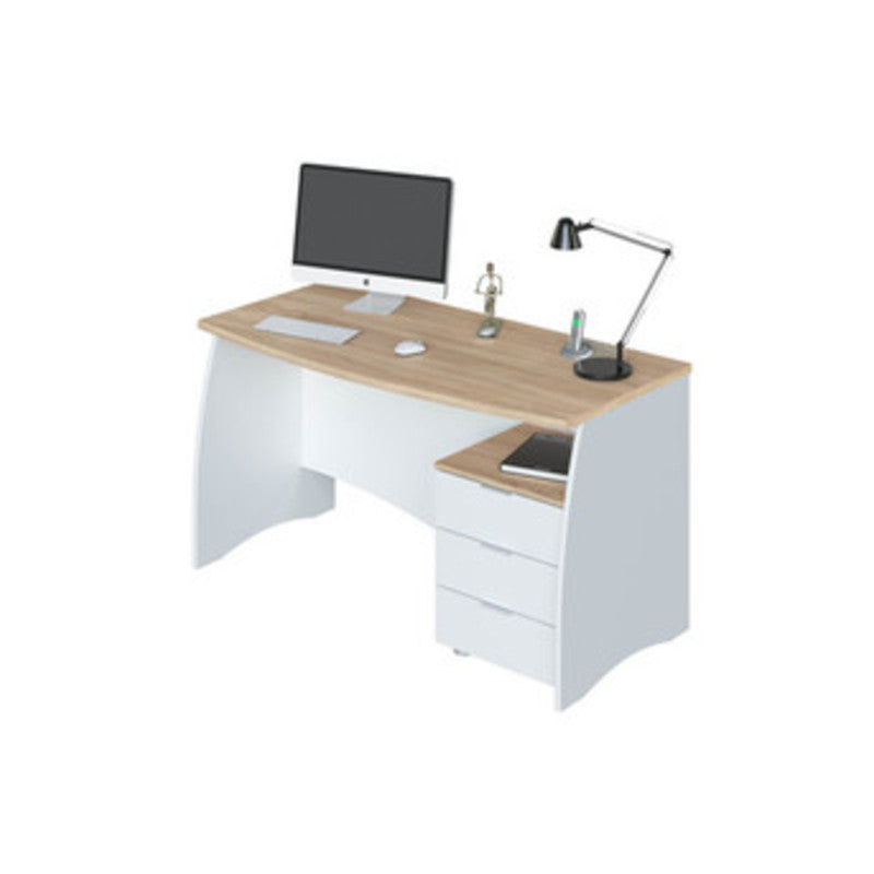 con struttura in truciolare rivestito in melaminico spessore 22 mm, 18 mm e 15 mm. Con comoda e capiente cassettiera 44 x 44 x h 55 cm formata da tre cassetti h 15 cm e comode maniglie in alluminio laccate color bianco. Guide scorrevoli in metallo per i cassetti (NON estraibili). Piedini ABS (termoplastico di alta resistenza) per la parte inferiore della cassettiera. Tacchetti ABS (termoplastico di alta resistenza) antirumore e antigraffio per la parte inferiore del mobile. Dimensioni scrivania 136 x 67 x h 74 cm. Colore bianco Artik e rovere Canadian. Non reversibile. Da montare. Peso 43 kg.