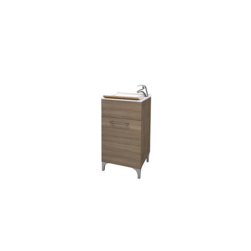 Mobile lavanderia in legno. Vasca e tavoletta in polipropilene resistente agli acidi. Completo di sifone. Predisposto per il montaggio del rubinetto monocomando (non compreso). Da montare. Dimensioni 45 x 50 x h 84 cm. Finitura rovere fumo