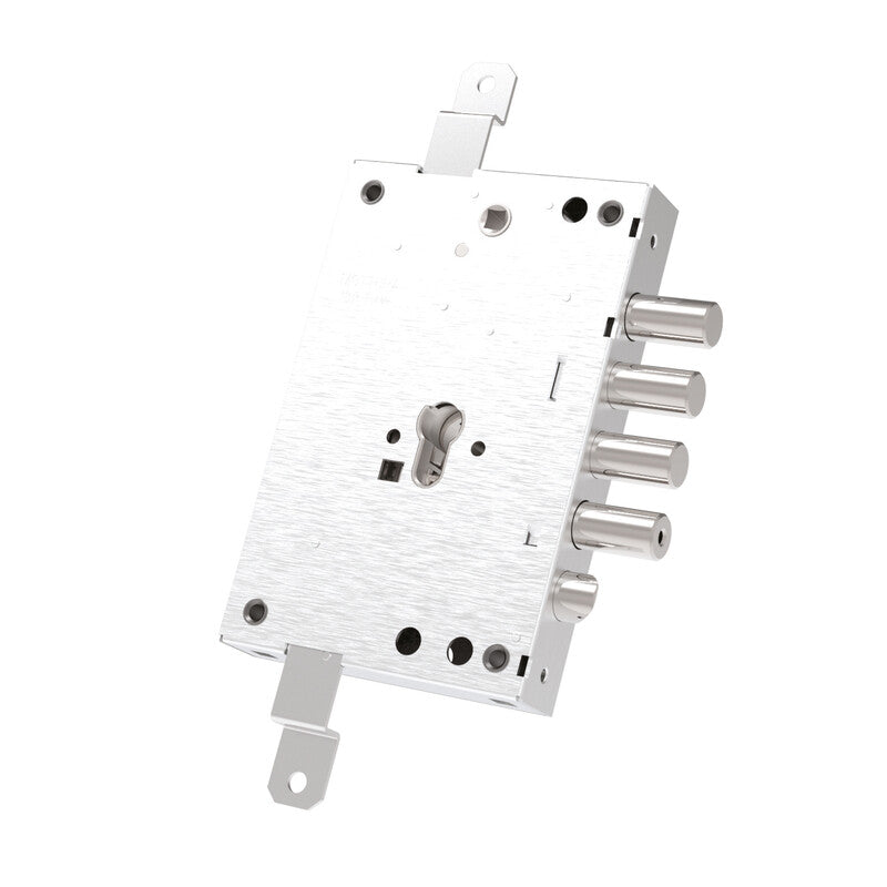 MOTTURA 82571 W700Q. Serratura per porte blindate CILINDRO EUROPEO.Triplice. Ad Applicare.INTERASSE 85mm.DOPPIO SISTEMA ANTI-INTRUSIONE CON BLOCCO.NUOVO SISTEMA FISSAGGIO CILINDRO NEW GEAR. AVANZAMENTO CATENACCI AD INGRANAGGI.Mano REVERSIBILE.ASTE NON COMPRESE. Base (mm) 136. Altezza (mm)206. 3 catenacci. Sporgenza catenacci + 03 mm. Entrata chiave 63mm.