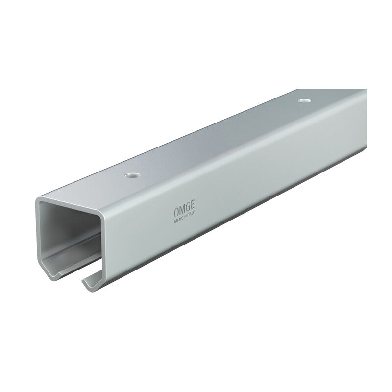 Art. 50 e pighevoli. Binario in acciaio zincato. Sezione 48x48 mm. Spessore 2 mm. Portata max 350 kg. Lunghezza 3 m.