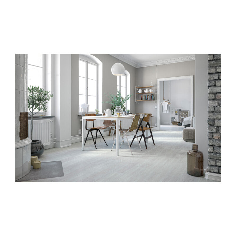 a incastro rapido, spessore 4,5 mm (doga 3,5 mm + 1,5 mm di tappetino) resistente allacqua e agli ambienti umidi come bagno e cucina. Riduce il rumore del calpestio. Non sbiadisce alla luce. Antiscivolo e antistatico. Classe di calpestio AC3 per uso domestico e commerciale leggero. Indicato per riscaldamento a pavimento. Resistente alla propagazione del fuoco. Dimensioni doga 179 x 1.220 mm. Scatola 10 doghe per 2,184 m2. Colore effetto legno rovere bianco Avignon.